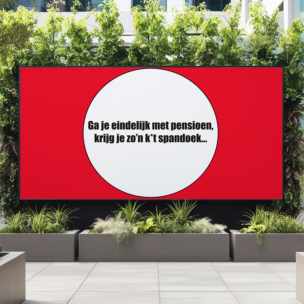 Misschien is dit wel hét spandoek voor een echte mopperkont die dan toch eindelijk met pensioen mag. Het is een leuke manier om die brombeer even lekker te laten lachen, maar eigenlijk kan iedereen met een flinke portie humor dit spandoek wel waarderen. Want ja, dan denk je eindelijk van je pensioen te kunnen gaan genieten en “dan komen zij weer aan met zo’n k*t spandoek!” Er zullen vast mensen zijn die je dit al meteen hoort zeggen, toch?