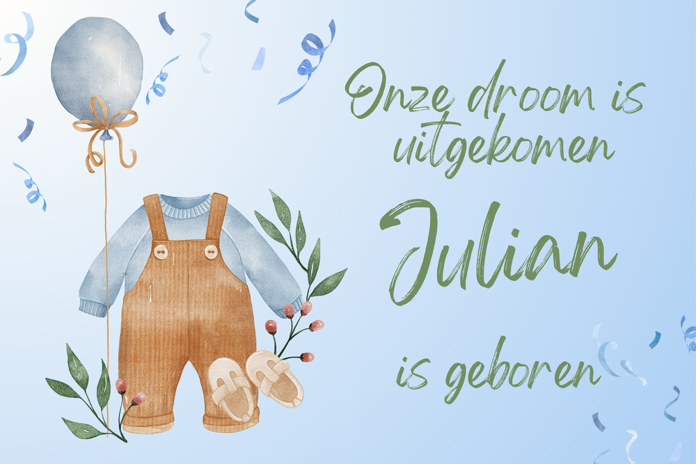 Het 'Geboorte spandoek - Onze droom is uitgekomen (jongen)' van Muursticker4sale is een prachtige manier om de geboorte van uw zoon aan te kondigen.Het spandoek is verkrijgbaar in vier formaten: 60 x 40 cm, 120 x 80 cm, 180 x 120 cm en 240 x 160 cm.Het ontwerp bevat de tekst "Onze droom is uitgekomen", wat de vreugde en trots van de ouders benadrukt.Het spandoek is gemaakt van hoogwaardige materialen, geschikt voor zowel binnen- als buitengebruik, en is voorzien van stevige ringen voor eenvoudige bevestiging.Met dit spandoek kunt u op een stijlvolle en zichtbare manier de komst van uw nieuwe gezinslid vieren.