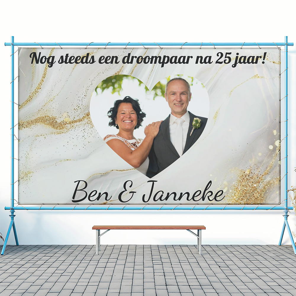 Het ontwerp van dit spandoek geeft al duidelijk aan dat er een bijzonder feestje gevierd mag worden. In het design spelen lichte tinten en goud de hoofdrol. Uiteindelijk heeft liefdesgeluk ook altijd een gouden randje! Met dit spandoek vier je een bruiloft of huwelijksjubileum op onvergetelijke wijze. Het voorbeeld ontwerp geeft aan dat het spandoek is bedoeld voor een 25-jarig huwelijksjubileum. Natuurlijk kun je dit makkelijk aanpassen, waardoor het bruiloft spandoek geschikt is voor elke trouw- en huwelijksgelegenheid.