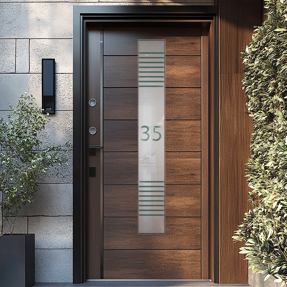 Een raamfolie met strepen op de voordeur: het is een moderne oplossing voor inkijk én tevens een goede manier om het huisnummer duidelijk te maken. Dit raamfolie kan op enkele manieren aangepast worden. De strepen behoren bij het vaste stramien en kunnen dus niet veranderd worden. Wel kunt u het huisnummer een ander lettertype geven en groter of kleiner maken. Ook kan het huisnummer zowel naar boven als onder worden gesleept. U kunt er ook voor kiezen om het huisnummer boven de strepen te plaatsen.