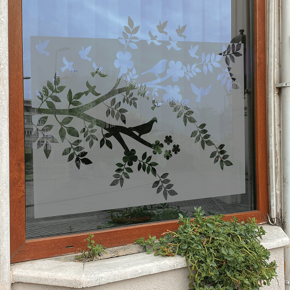 Maak je ramen levendig met onze "Vogels op Tak" raamfolie. Deze prachtige decoratie, uitgesneden uit hoogwaardige raamfolie, brengt de natuur naar binnen met een uniek design. Elke vogel en tak is zorgvuldig uitgesneden voor een realistische uitstraling. De folie is volledig op maat te maken voor jouw raam, zodat het perfect past en gemakkelijk aan te brengen is. Met een levensduur van 10 jaar en een lichtdoorlatendheid van 65%, is deze raamfolie zowel praktisch als stijlvol. Voeg een vleugje natuur toe aan je interieur!