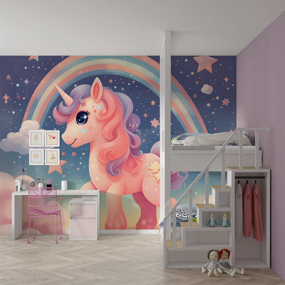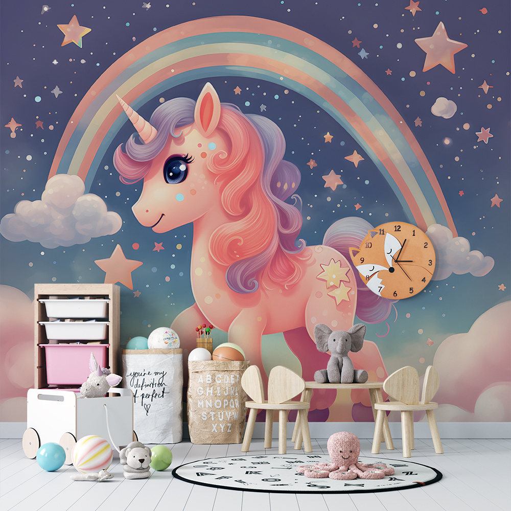 Laat je fantasie de vrije loop met ons betoverende regenboog en eenhoorn behang. Dit levendige ontwerp vangt de magie van eenhoorns en regenbogen, waardoor elke kamer tot leven komt. Gemaakt van hoogwaardig behangmateriaal, biedt ons behang een duurzame en eenvoudige installatie. Het is afwasbaar en scheurbestendig, waardoor het ideaal is voor drukke ruimtes. Breng een vleugje kleur en vreugde in je interieur met dit charmante regenboog en eenhoorn behang.
