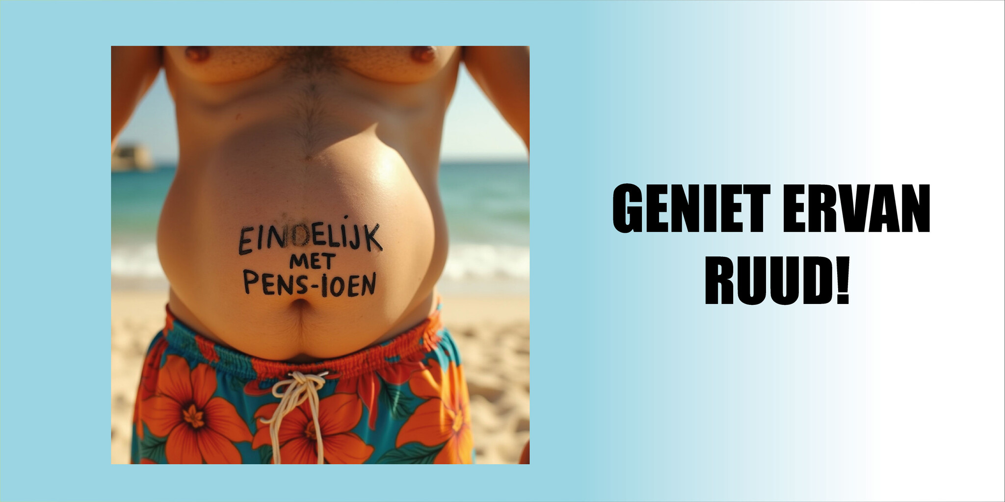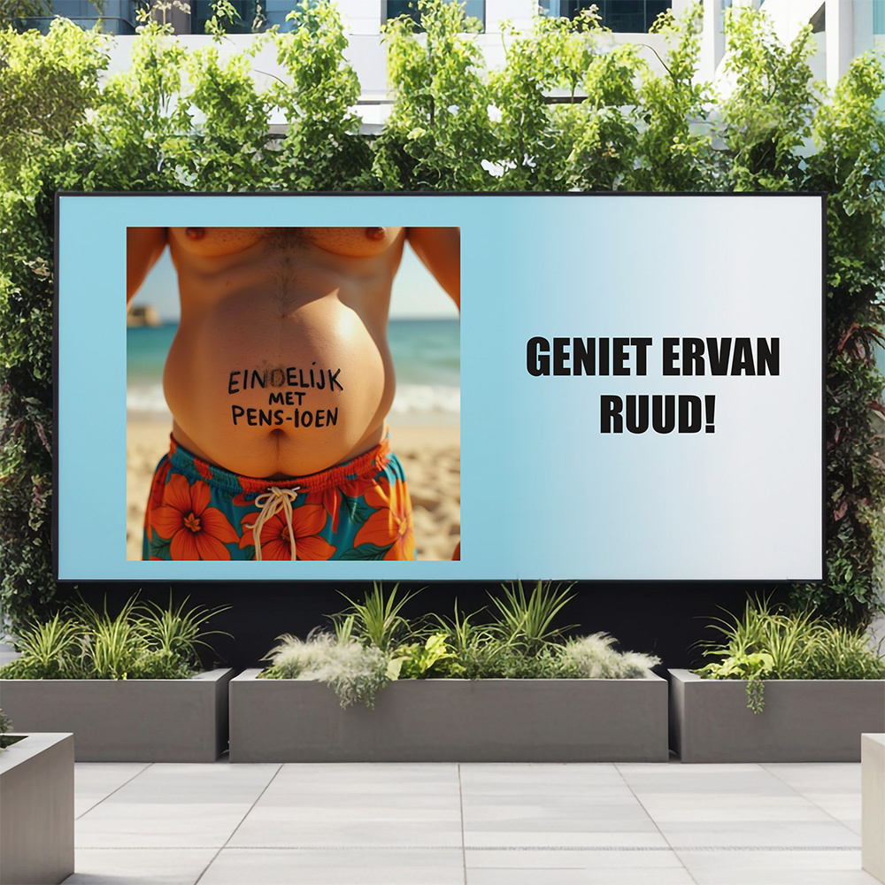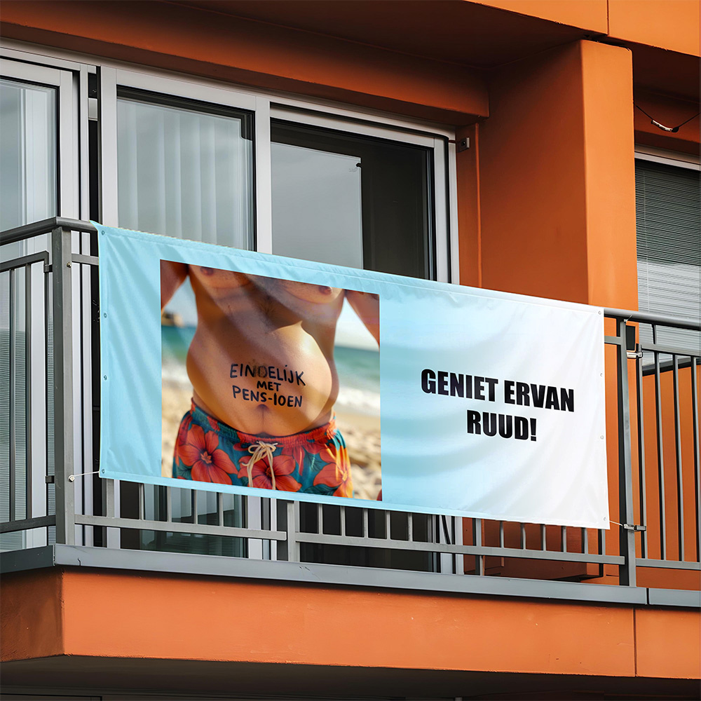Is de start van een lekker bierbuikje al ingezet op het moment dat het pensioen ingaat? Dan is dit hét spandoek om het mee te vieren. Uiteindelijk is het begin van het pensioen natuurlijk ook het moment waarop je door mag gaan met het opbouwen van je ‘one-pack’. Lekker genieten van je vrije tijd en alles wat daarbij hoort. Met dit grappige spandoek wordt het begin van het pensioen op een leuke manier gevierd.