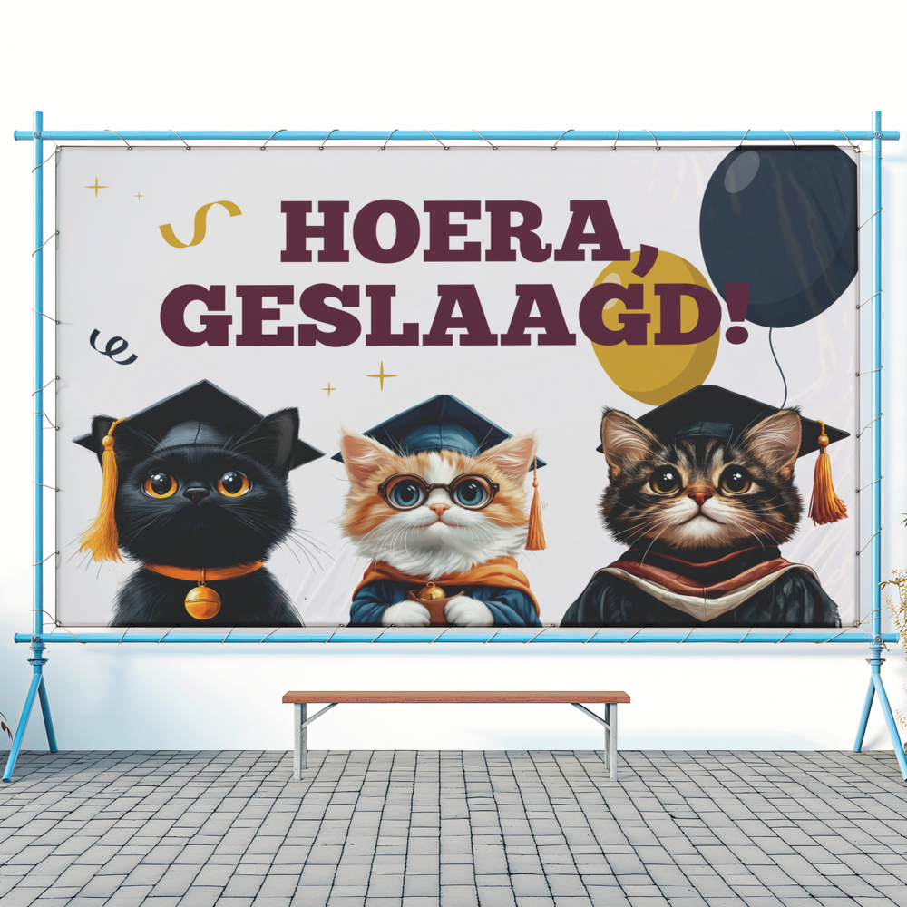 Of het nu gaat om het behalen van een diploma voor de middelbare school, mbo, hbo of universiteit, dit geslaagd spandoek is een geweldige manier om de geslaagde te feliciteren. De schattige poezen maken het nog specialer voor dierenvrienden.
