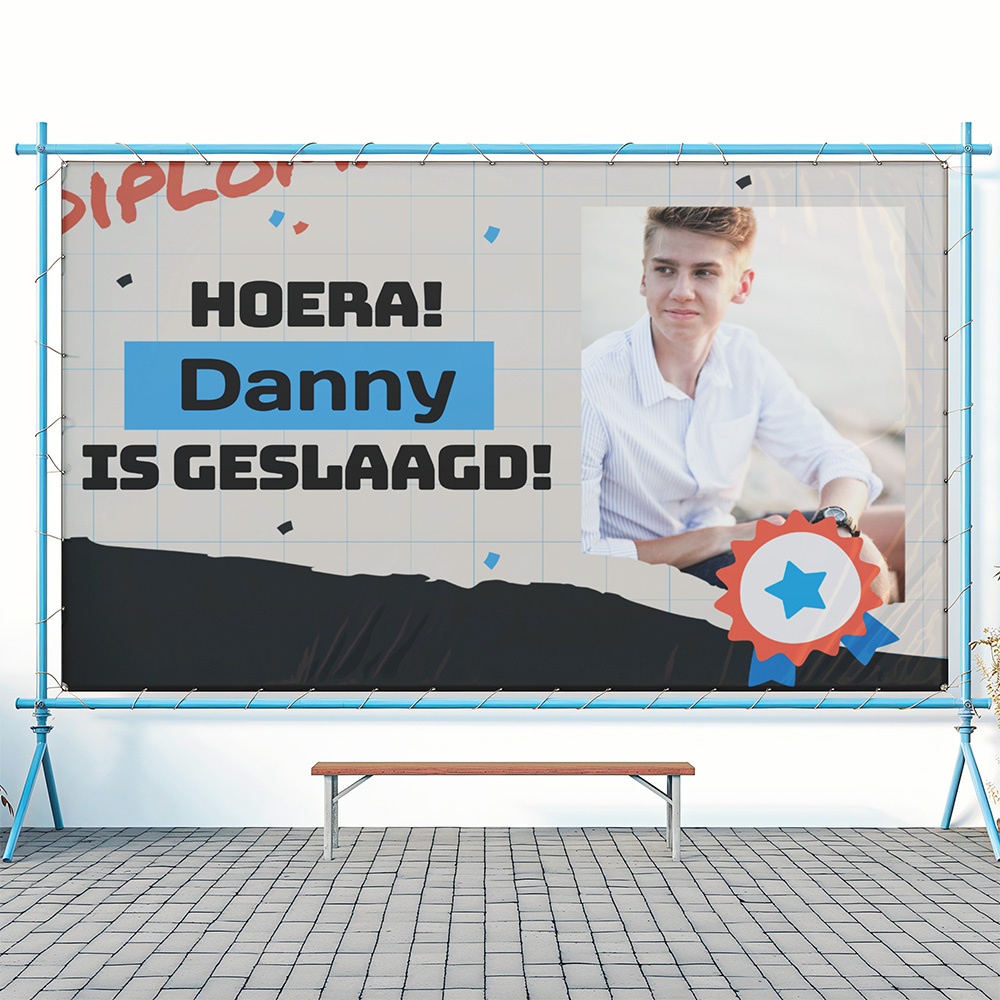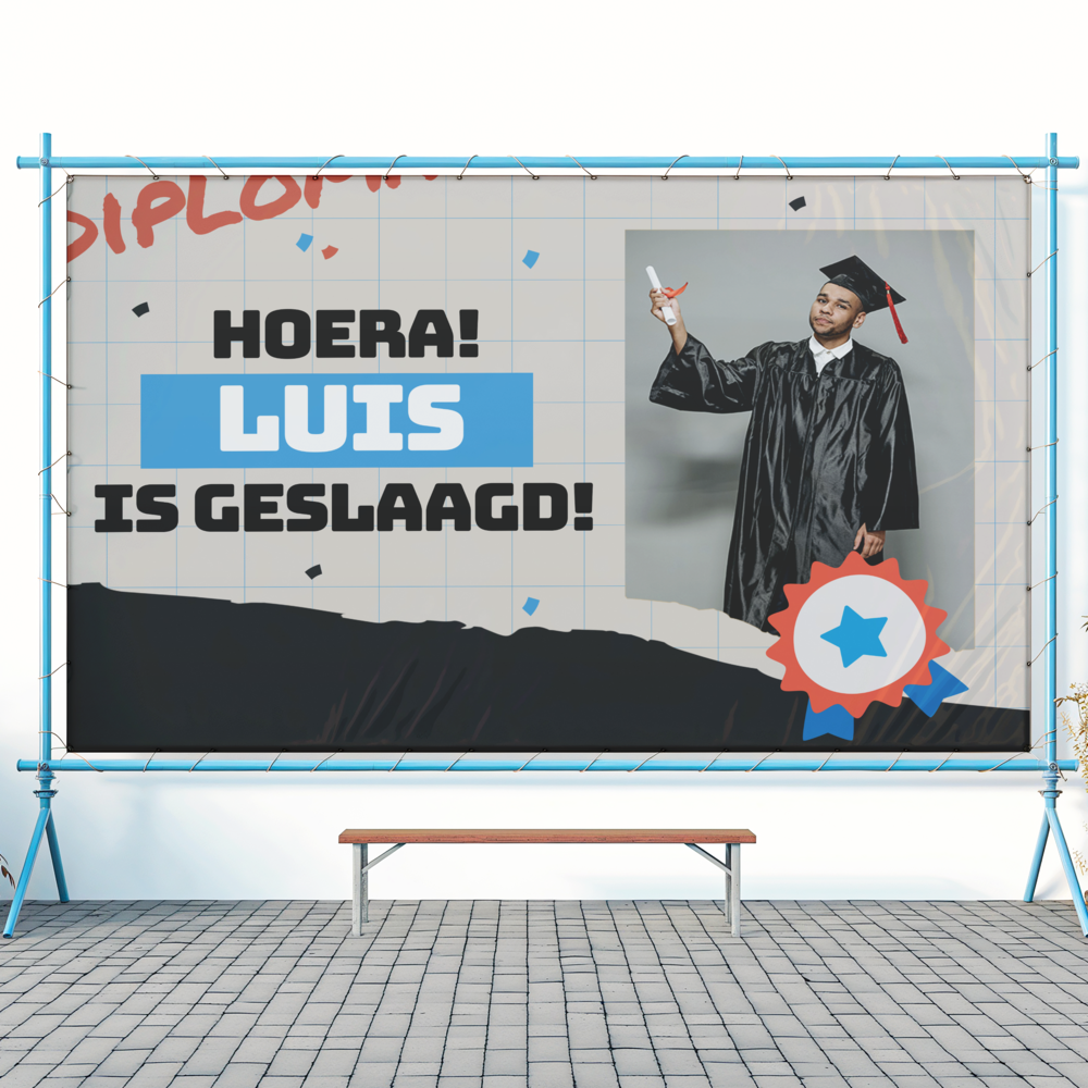 Vier het geweldige succes van de geslaagde met dit unieke geslaagd spandoek. Het spandoek is voorzien van de vrolijke tekst "Hoera, geslaagd!", en biedt je de mogelijkheid om de naam van de geslaagde toe te voegen. Via onze eenvoudige ontwerptool kun je ook een foto van de geslaagde uploaden, waardoor dit spandoek een persoonlijke touch krijgt. Dit spandoek is niet alleen een manier om het succes te vieren, maar ook een blijvende herinnering aan een belangrijke mijlpaal.