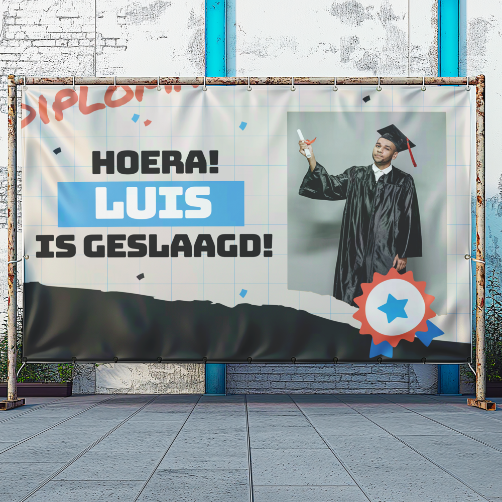 Hoera Geslaagd Spandoek – Gepersonaliseerd voor de Geslaagde